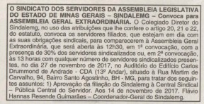 O Sindalemg convoca para Assembleia Geral Extraordinária. Data: 27 de novembro de 2017;Horário: 12h30;Local: Auditório do Edifício Carlos Drumond de Andrade (13º Andar);Assunto: Aprovação da filiação do Sindalemg à Central Sindical Pública (conforme Art. 58 do Estatuto do Sindalemg). O Edital foi publicado na edição do dia 14 de novembro de 2017 do jornal “O Tempo” (reproduzido abaixo). Participe!