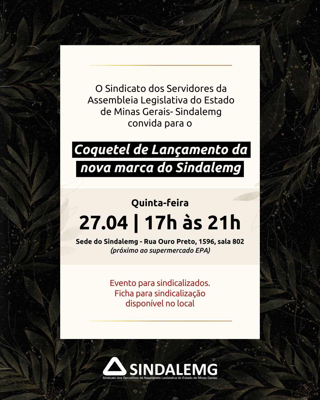 CONVITE – COQUETEL DE LANÇAMENTO DA NOVA MARCA DO SINDALEMG (27/4)