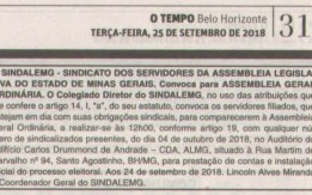 O Sindalemg convoca seus associados para Assembleia Geral Ordinária a realizar-se às 12 horas do próximo dia 4 de outubro de 2018, no auditório do Edifício Carlos Drumond de Andrade, conforme Edital publicado no Jornal O Tempo.